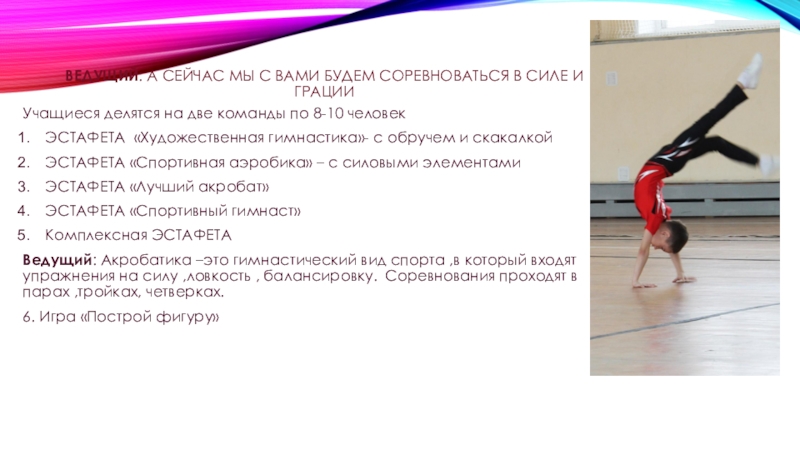 Ведущий: Акробатика –это гимнастический вид спорта ,в который входят упражнения на силу ,ловкость , балансировку. Соревнования проходят в парах ,тройках, четверках.