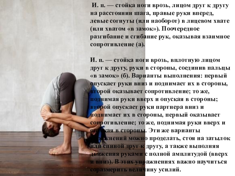 расстоянии шага, правые руки вперед, левые согнуты (или наоборот) в лицевом хвате (или хватом «в замок»). Поочередное разгибание и сгибание рук, оказывая взаимное сопротивление (а).