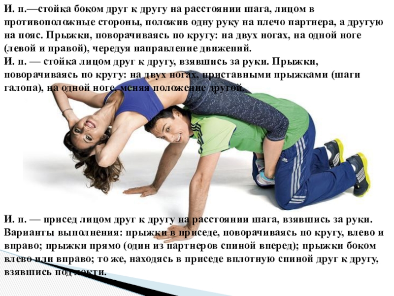 противоположные стороны, положив одну руку на плечо партнера, а другую на пояс. Прыжки, поворачиваясь по кругу: на двух ногах, на одной ноге (левой и правой), чередуя направление движений.