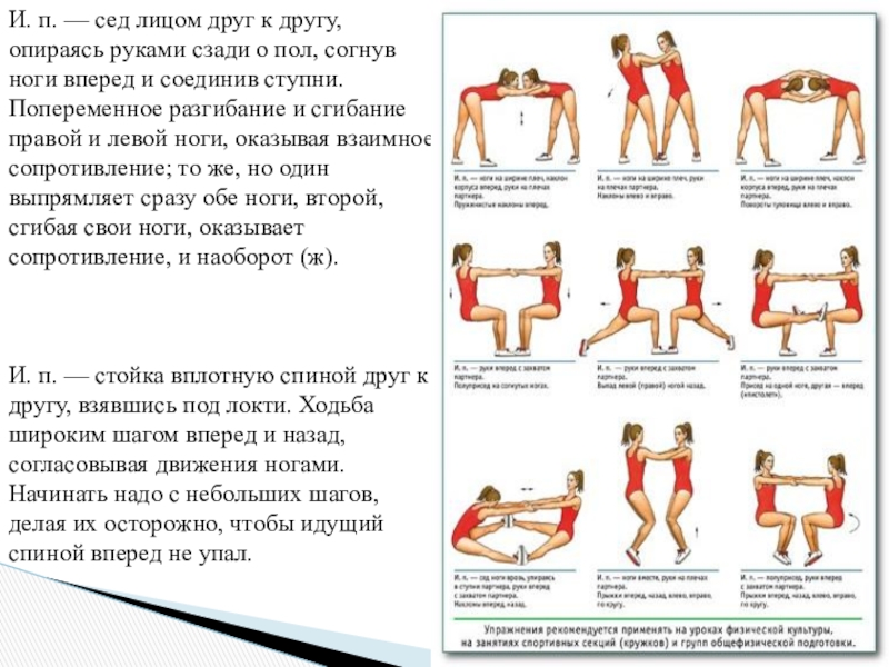 Слайд 5И. п. — сед лицом друг к другу, опираясь руками сзади