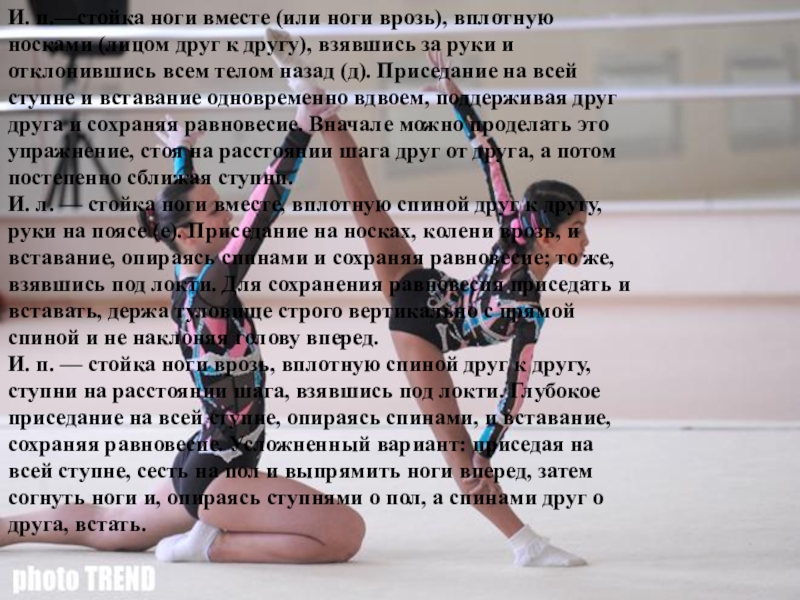 И. л. — стойка ноги вместе, вплотную спиной друг к другу, руки на поясе (е). Приседание на носках, колени врозь, и вставание, опираясь спинами и сохраняя равновесие; то же, взявшись под локти. Для сохранения равновесия приседать и вставать, держа туловище строго вертикально с прямой спиной и не наклоняя голову вперед.