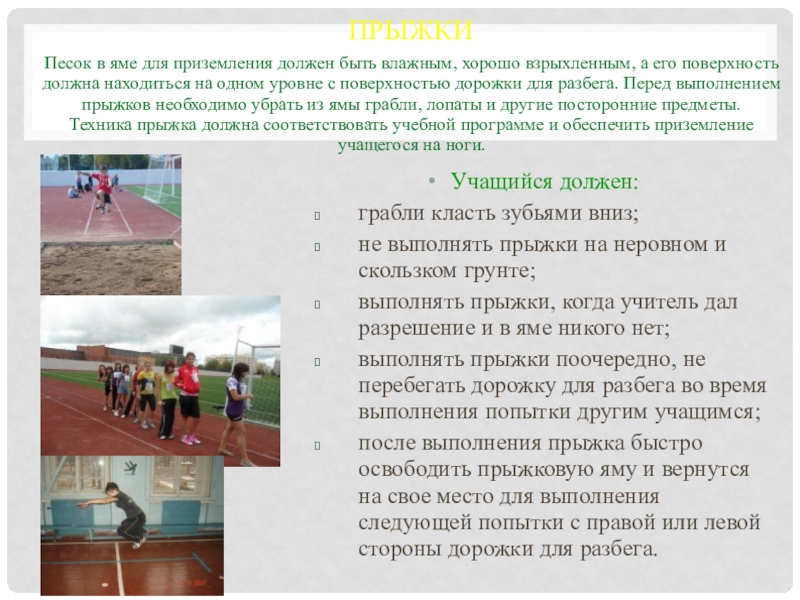 Песок в яме для приземления должен быть влажным, хорошо взрыхленным, а его поверхность должна находиться на одном уровне с поверхностью дорожки для разбега. Перед выполнением прыжков необходимо убрать из ямы грабли, лопаты и другие посторонние предметы.
