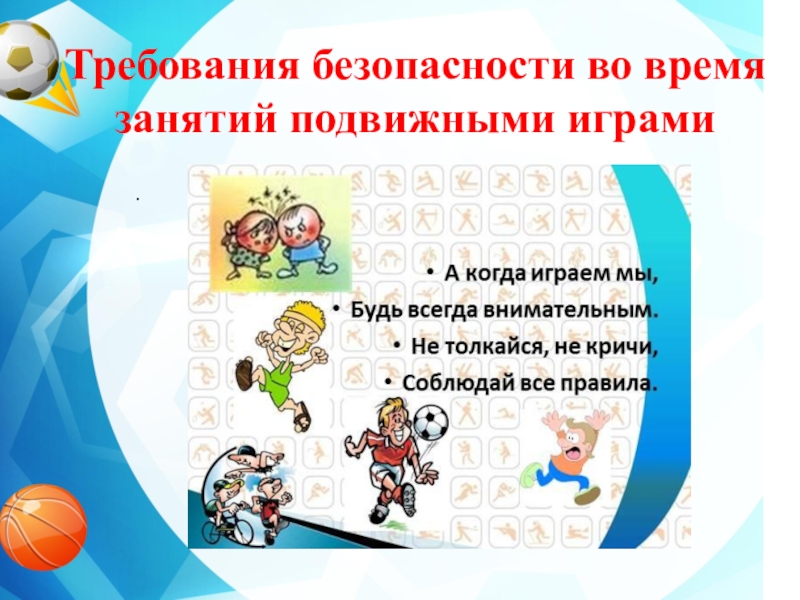 Слайд 23Требования безопасности во время занятий подвижными играми