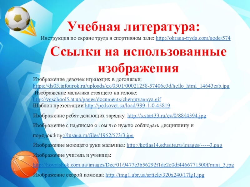Инструкция по охране труда в спортивном зале: http://ohrana-tryda.com/node/574  Учебная литература:Ссылки на использованные изображенияИзображение девочек играющих