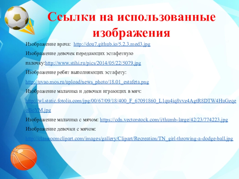 Изображение врача: http://dou7.github.io/5.2.3.med3.jpgИзображение девочек передающих эстафетную палочку:http://www.stihi.ru/pics/2014/05/22/5079.jpgИзображение ребят выполняющих эстафету: http://uvao.mos.ru/upload/news_photo/18.01_estafeta.pngИзображение мальчика и девочки играющих в
