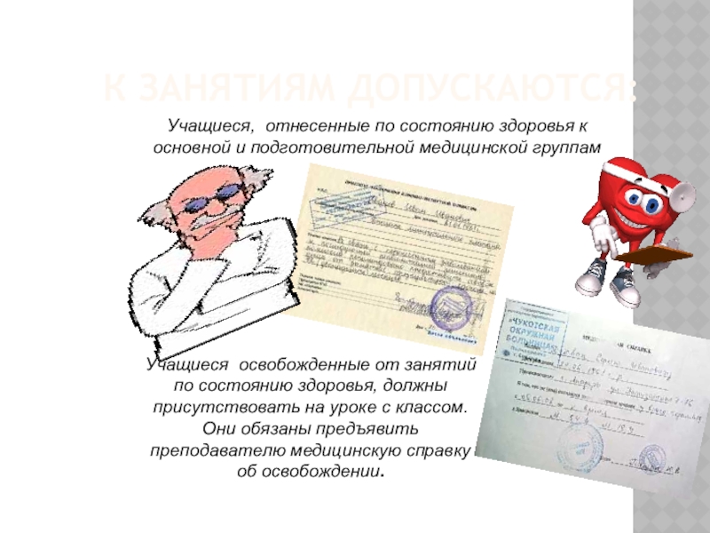 Учащиеся освобожденные от занятий по состоянию здоровья, должны присутствовать на уроке с классом. Они обязаны предъявить преподавателю медицинскую справку об освобождении.