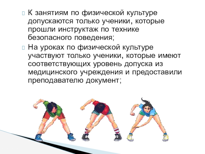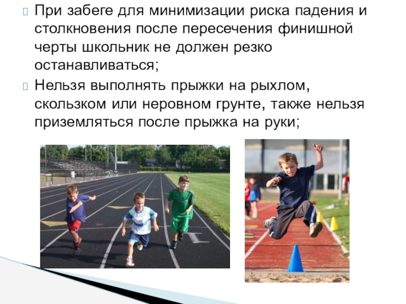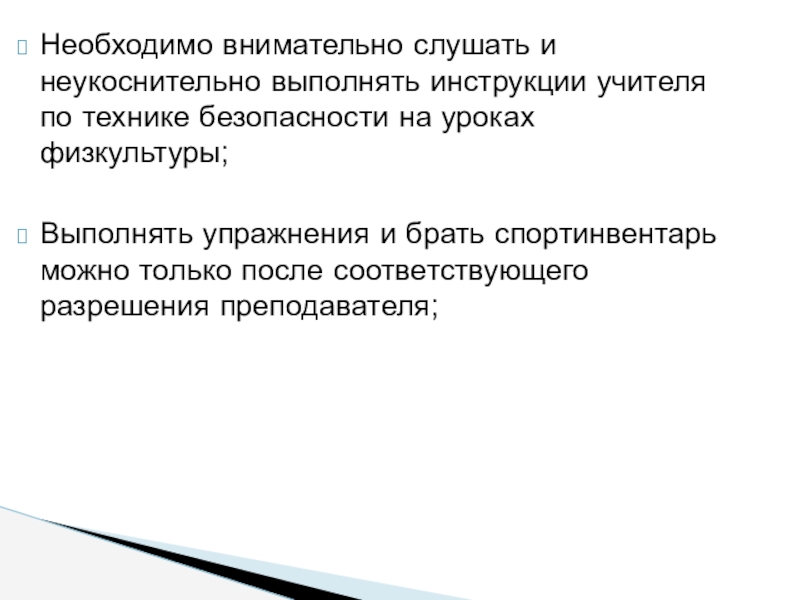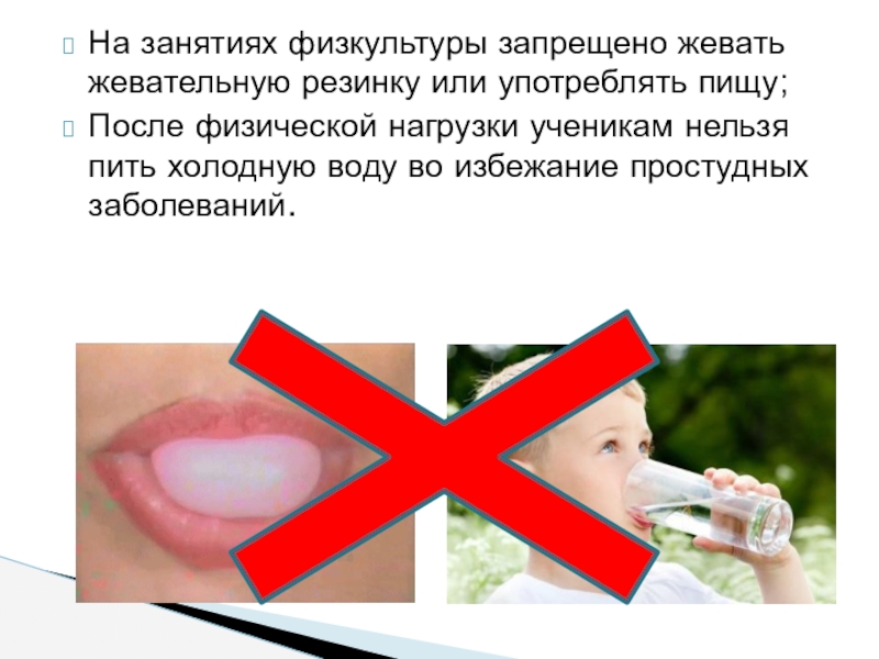 Ученикам запрещено несанкционировано менять траекторию движения, делать опасные движения или броски предметов, выполнять упражнения на брусьях и перекладине с влажными ладонями, баловаться и мешать проведению занятия;