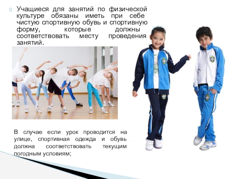 В случае если урок проводится на улице, спортивная одежда и обувь должна соответствовать текущим погодным условиям;
