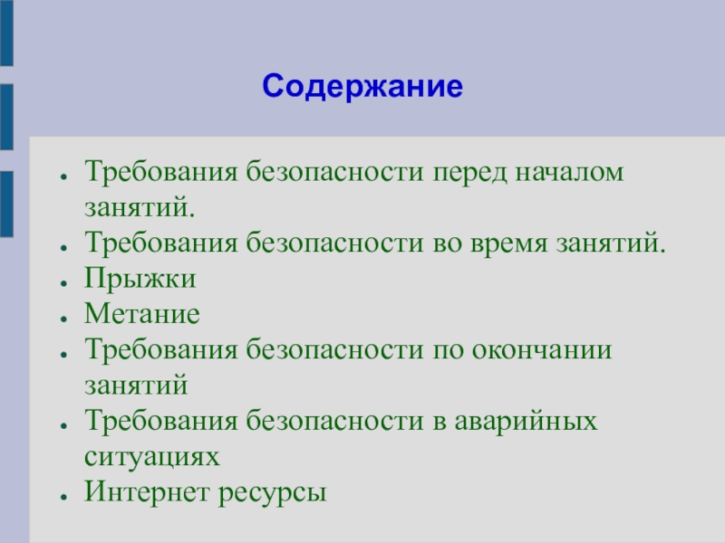 СодержаниеТребования безопасности перед началом занятий.Требования безопасности во время занятий. ПрыжкиМетаниеТребования безопасности по окончании занятийТребования безопасности в аварийных ситуацияхИнтернет ресурсы