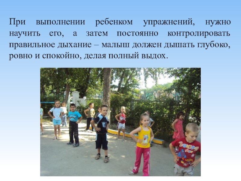 Слайд 9При выполнении ребенком упражнений, нужно научить его, а затем постоянно контролировать