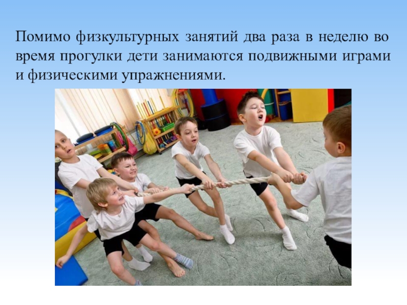 Помимо физкультурных занятий два раза в неделю во время прогулки дети занимаются подвижными играми и физическими упражнениями.