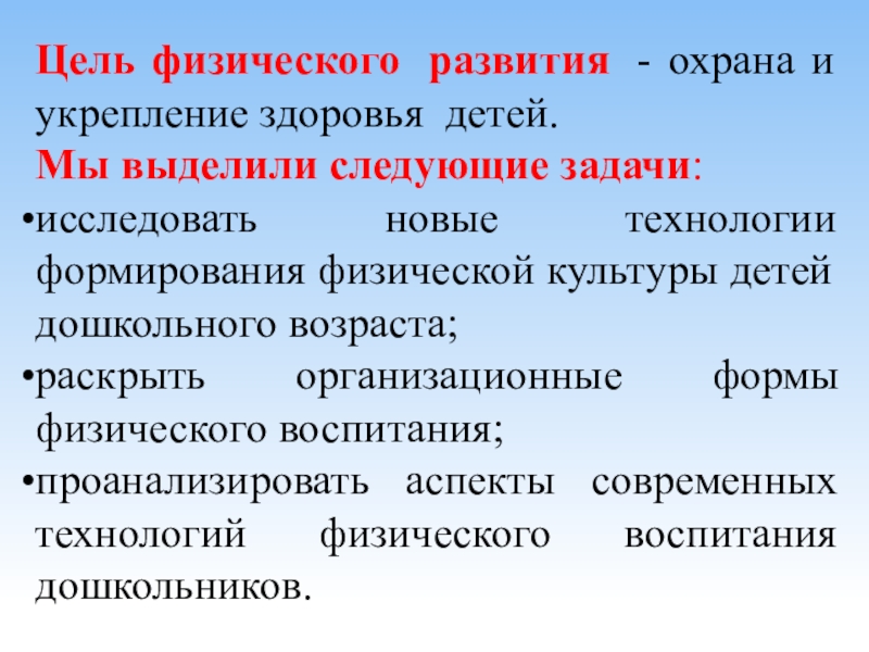 Цель физического  развития  - охрана и укрепление здоровья  детей.Мы выделили следующие задачи: исследовать новые технологии формирования физической культуры детей дошкольного возраста; раскрыть организационные формы физического воспитания; проанализировать аспекты современных технологий физического воспитания дошкольников.