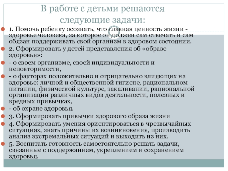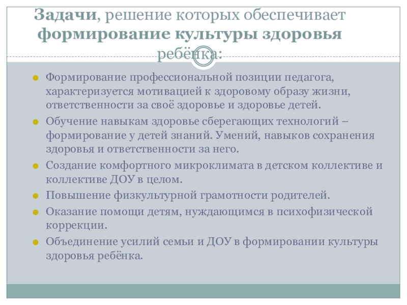 Слайд 12Задачи, решение которых обеспечивает формирование культуры здоровья ребёнка: