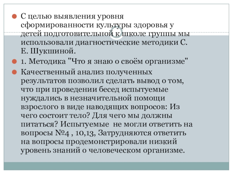 Качественный анализ полученных результатов позволил сделать вывод о том, что при проведении бесед испытуемые нуждались в незначительной помощи взрослого в виде наводящих вопросов: Из чего состоит тело? Для чего мы должны питаться? Испытуемые не могли ответить на вопросы №4 , 10,13, Затрудняются ответить на вопросы продемонстрировали низкий уровень знаний о человеческом организме.
