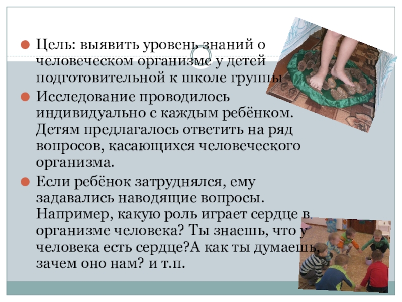 Слайд 11Цель: выявить уровень знаний о человеческом организме у детей подготовительной к