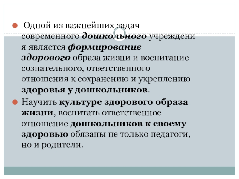 Слайд 5 Одной из важнейших задач современного дошкольного учреждения является формирование здорового образа жизни и воспитание