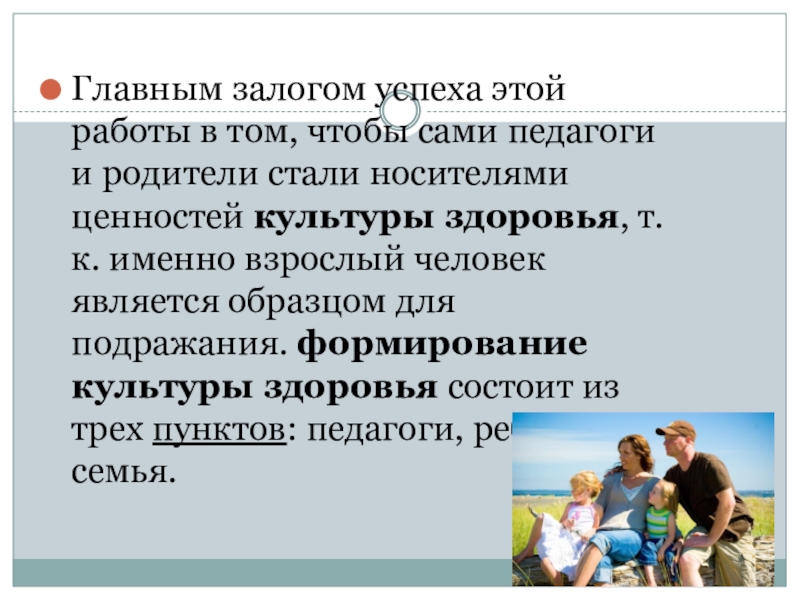 родители стали носителями ценностей культуры здоровья, т. к. именно взрослый человек является образцом для подражания. формирование культуры здоровья состоит из трех пунктов: педагоги, ребёнок, семья.