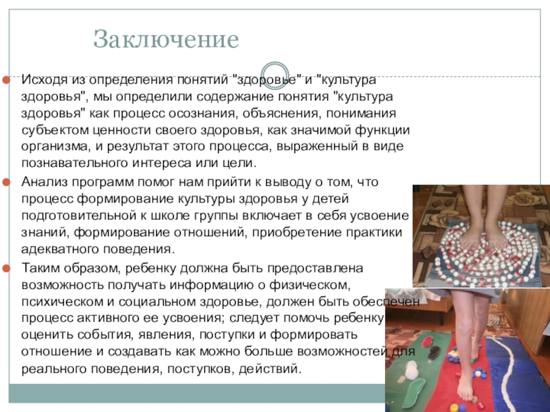 Анализ программ помог нам прийти к выводу о том, что процесс формирование культуры здоровья у детей подготовительной к школе группы включает в себя усвоение знаний, формирование отношений, приобретение практики адекватного поведения.