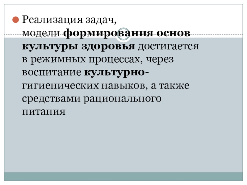 Слайд 7Реализация задач, модели формирования основ культуры здоровья достигается в режимных процессах, через воспитание культурно-гигиенических