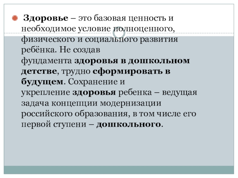 социального развития ребёнка. Не создав фундамента здоровья в дошкольном детстве, трудно сформировать в будущем. Сохранение и укрепление здоровья ребенка – ведущая задача концепции модернизации российского образования, в том числе его первой ступени – дошкольного.