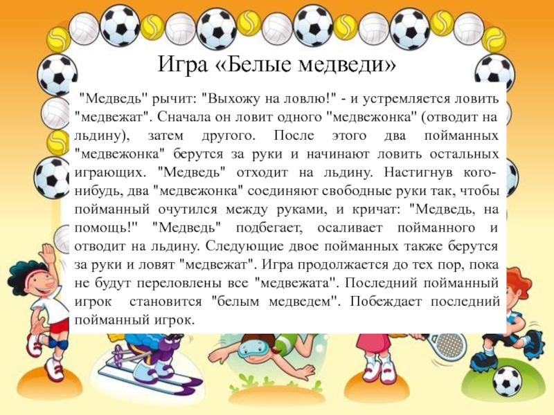 "медвежат". Сначала он ловит одного "медвежонка" (отводит на льдину), затем другого. После этого два пойманных "медвежонка" берутся за руки и начинают ловить остальных играющих. "Медведь" отходит на льдину. Настигнув кого-нибудь, два "медвежонка" соединяют свободные руки так, чтобы пойманный очутился между руками, и кричат: "Медведь, на помощь!" "Медведь" подбегает, осаливает пойманного и отводит на льдину. Следующие двое пойманных также берутся за руки и ловят "медвежат". Игра продолжается до тех пор, пока не будут переловлены все "медвежата". Последний пойманный игрок становится "белым медведем". Побеждает последний пойманный игрок.