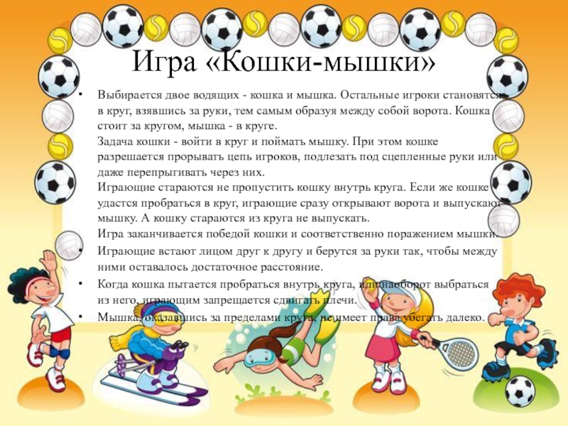 Задача кошки - войти в круг и поймать мышку. При этом кошке разрешается прорывать цепь игроков, подлезать под сцепленные руки или даже перепрыгивать через них.