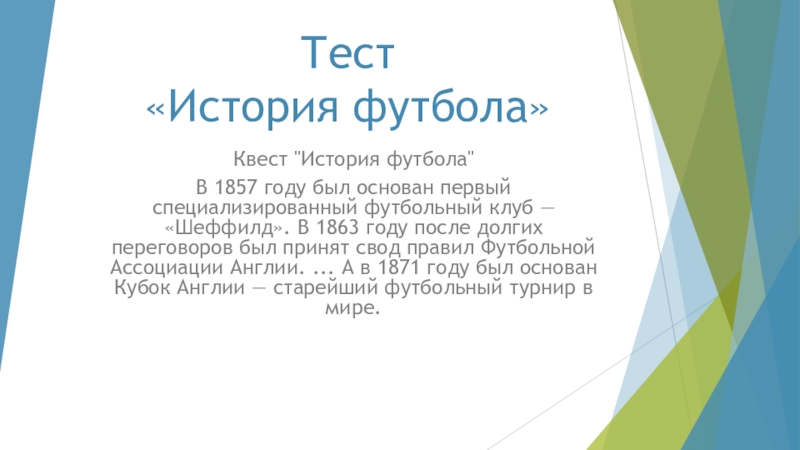 футбольный клуб — «Шеффилд». В 1863 году после долгих переговоров был принят свод правил Футбольной Ассоциации Англии. ... А в 1871 году был основан Кубок Англии — старейший футбольный турнир в мире.