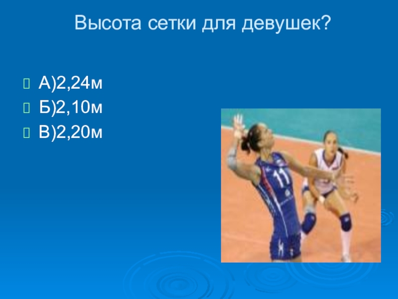 Высота сетки для девушек? А)2,24мБ)2,10мВ)2,20м