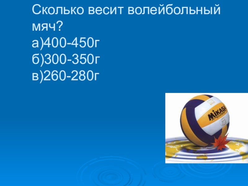 Слайд 2Сколько весит волейбольный мяч? а)400-450г б)300-350г в)260-280г