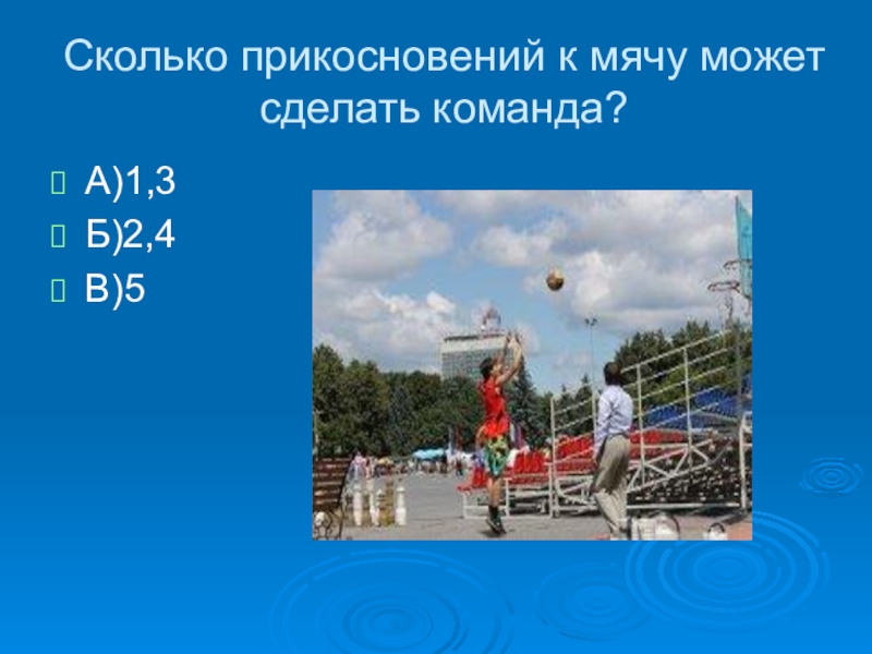 Сколько прикосновений к мячу может сделать команда?А)1,3Б)2,4В)5