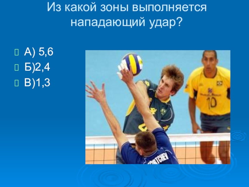 Из какой зоны выполняется нападающий удар? А) 5,6Б)2,4В)1,3