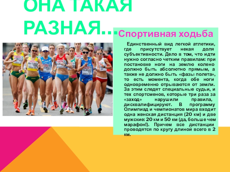 в том, что идти нужно согласно четким правилам: при постановке ноги на землю колено должно быть абсолютно прямым, а также не должно быть «фазы полета», то есть момента, когда обе ноги одновременно отрываются от земли. За этим следят специальные судьи, и тех спортсменов, которые три раза за «заход» нарушили правила, дисквалифицируют. В программу Олимпиад и чемпионатов мира входит одна женская дистанция (20 км) и две мужские: 20 км и 50 км (да, больше чем марафон!). Причем все дистанции проводятся по кругу длиной всего в 2 км.