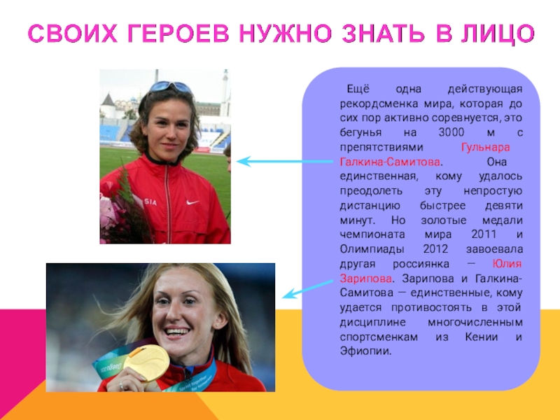 это бегунья на 3000 м с препятствиями Гульнара Галкина-Самитова. Она единственная, кому удалось преодолеть эту непростую дистанцию быстрее девяти минут. Но золотые медали чемпионата мира 2011 и Олимпиады 2012 завоевала другая россиянка — Юлия Зарипова. Зарипова и Галкина-Самитова — единственные, кому удается противостоять в этой дисциплине многочисленным спортсменкам из Кении и Эфиопии.