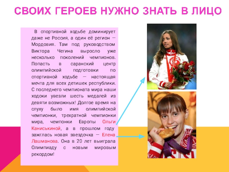 — Мордовия. Там под руководством Виктора Чегина выросло уже несколько поколений чемпионов. Попасть в саранский центр олимпийской подготовки по спортивной ходьбе — настоящая мечта для всех детишек республики. С последнего чемпионата мира наши ходоки увезли шесть медалей из девяти возможных! Долгое время на слуху было имя олимпийской чемпионки, трехратной чемпионки мира, чемпонки Европы Ольги Каниськиной, а в прошлом году зажглась новая звездочка — Елена Лашманова. Она в 20 лет выиграла Олимпиаду с новым мировым рекордом!