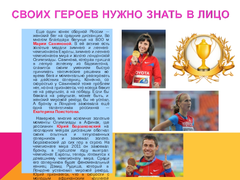 Во многом благодаря бегунье на 800 м Марии Савиновой. В её активе есть золотые медали зимнего и летнего чемпионатов Европы, зимнего и летнего чемпионатов мира и золото лондонской Олимпиады. Савинова, которая пришла в легкую атлетику из бадминтона, славится своим умением быстро принимать тактические решения во время бега и моментально реагировать на действия соперниц. Конечно, со скоростью у Савиновой тоже проблем нет, но она признается, что всегда бежит не на результат, а на победу. Если бы бежала на результат, может быть, и женский мировой рекорд бы не устоял. А бронзу в Лондоне завоевала ещё одна талантливая россиянка — Екатерина Поистогова.