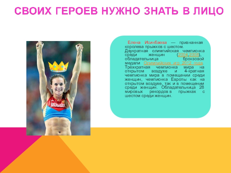 Слайд 16 Елена Исинбаева — признанная королева прыжков с шестом. Двукратная олимпийская чемпионка