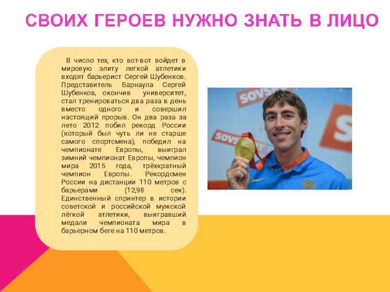 входят барьерист Сергей Шубенков. Представитель Барнаула Сергей Шубенков, окончив университет, стал тренироваться два раза в день вместо одного и совершил настоящий прорыв. Он два раза за лето 2012 побил рекорд России (который был чуть ли не старше самого спортсмена), победил на чемпионате Европы, выиграл зимний чемпионат Европы, чемпион мира 2015 года, трёхкратный чемпион Европы. Рекордсмен России на дистанции 110 метров с барьерами (12,98 сек). Единственный спринтер в истории советской и российской мужской лёгкой атлетики, выигравший медали чемпионата мира в барьерном беге на 110 метров.