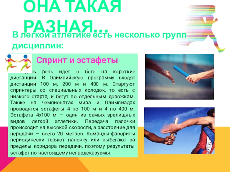 Здесь речь идет о беге на короткие дистанции. В Олимпийскую программу входят дистанции 100 м, 200 м и 400 м. Стартуют спринтеры со специальных колодок, то есть с низкого старта, и бегут по отдельным дорожкам. Также на чемпионатах мира и Олимпиадах проводятся эстафеты 4 по 100 м и 4 по 400 м. Эстафета 4х100 м — один из самых зрелищных видов легкой атлетики. Передача палочки происходит на высокой скорости, а расстояние для передачи — всего 20 метров. Команды-фавориты периодически теряют палочку или выбегают за пределы коридора передачи, поэтому результаты эстафет по-настоящему непредсказуемы.