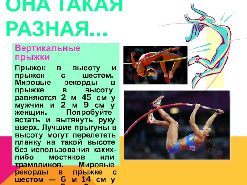 рекорды в прыжке в высоту равняются 2 м 45 см у мужчин и 2 м 9 см у женщин. Попробуйте встать и вытянуть руку вверх. Лучшие прыгуны в высоту могут перелететь планку на такой высоте без использования каких-либо мостиков или трамплинов. Мировые рекорды в прыжке с шестом — 6 м 14 см у мужчин и 5 м 6 см у женщин.
