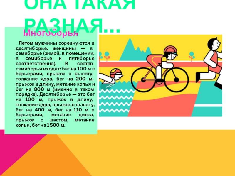 помещении, в семиборье и пятиборье соответственно). В состав семиборья входят: бег на 100 м с барьерами, прыжок в высоту, толкание ядра, бег на 200 м, прыжок в длину, метание копья и бег на 800 м (именно в таком порядке). Десятиборье — это бег на 100 м, прыжок в длину, толкание ядра, прыжок в высоту, бег на 400 м, бег на 110 м с барьерами, метание диска, прыжок с шестом, метание копья, бег на 1500 м.