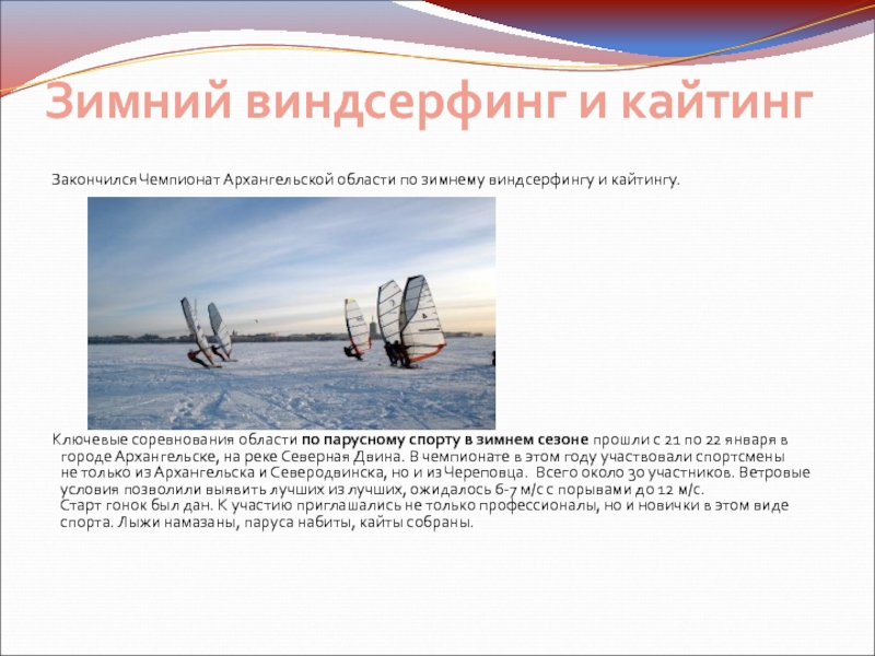 Слайд 12Зимний виндсерфинг и кайтинг