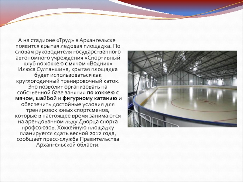 Слайд 8А на стадионе «Труд» в Архангельске появится крытая ледовая площадка. По