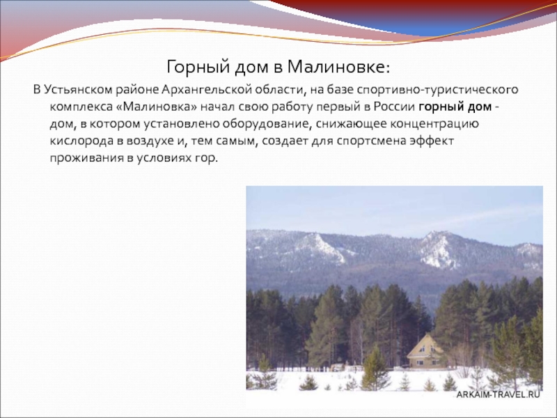 комплекса «Малиновка» начал свою работу первый в России горный дом - дом, в котором установлено оборудование, снижающее концентрацию кислорода в воздухе и, тем самым, создает для спортсмена эффект проживания в условиях гор.