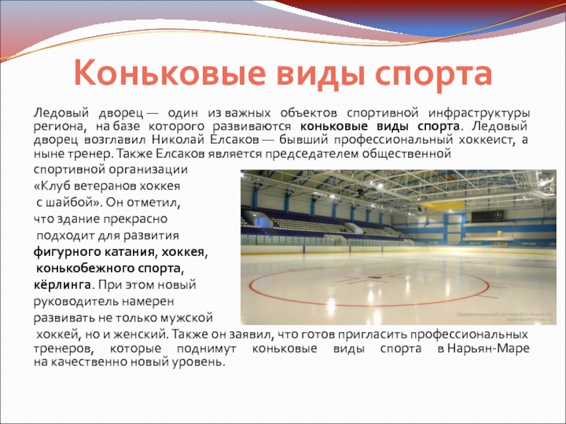которого развиваются коньковые виды спорта. Ледовый дворец возглавил Николай Елсаков — бывший профессиональный хоккеист, а ныне тренер. Также Елсаков является председателем общественной