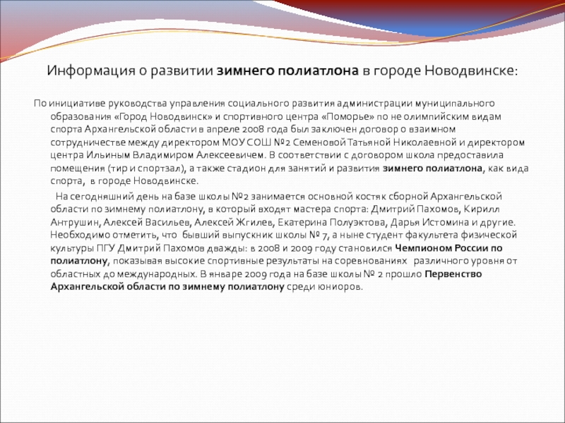 Слайд 6Информация о развитии зимнего полиатлона в городе Новодвинске: