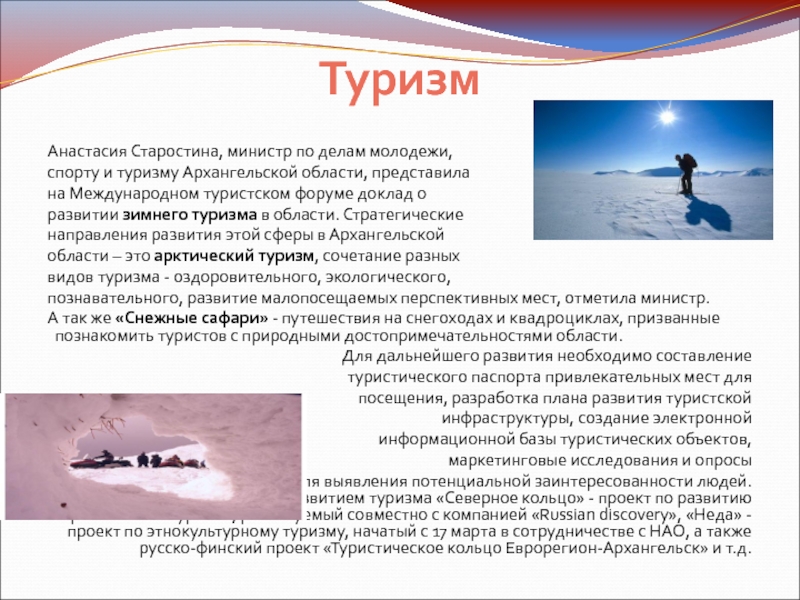 Непосредственно связаны с развитием туризма «Северное кольцо» - проект по развитию арктического туризма, реализуемый совместно с компанией «Russian discovery», «Неда» - проект по этнокультурному туризму, начатый с 17 марта в сотрудничестве с НАО, а также русско-финский проект «Туристическое кольцо Еврорегион-Архангельск» и т.д.