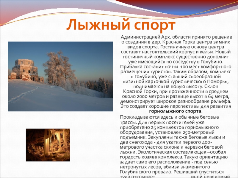Прокладываются здесь и обычные беговые трассы. Для первых посетителей уже приобретено 25 комплектов горнолыжного оборудования, установлен 250-метровый подъемник. Закуплены также беговые лыжи и два снегохода - для укатки первого 400-метрового участка склона и нарезки беговой лыжни. Экологическая составляющая –особая гордость хозяев комплекса. Такую ориентацию задает само его расположение - под сенью нетронутых лесов, вблизи знаменитого Голубинского провала. Решивший спуститься туда открывает иной,неведомый мир - мир пинежских пещер. Особенно хороши пещеры зимой, когда мороз разукрашивает их своей искрометной фантазией.