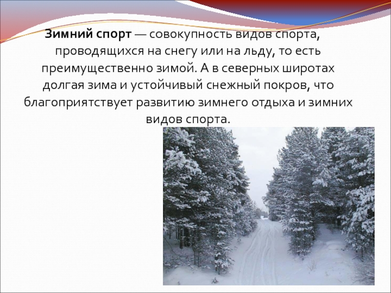 Слайд 2Зимний спорт — совокупность видов спорта, проводящихся на снегу или на льду,