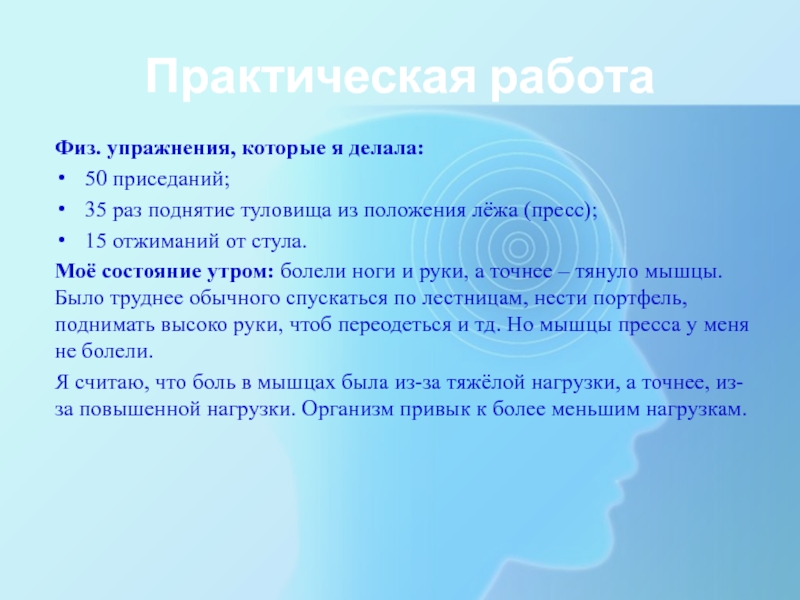 Самым интересным для меня стало проведение практической работы. Я на личном примере поняла, что при повышении нагрузки, появляется боль в мышцах, т.к. организм, привыкая к обычной нагрузке, перестаёт на неё реагировать. Он воспринимает эту нагрузку как своё привычное состояние. А когда нагрузка повышается, организм «даёт» на неё реакцию.
