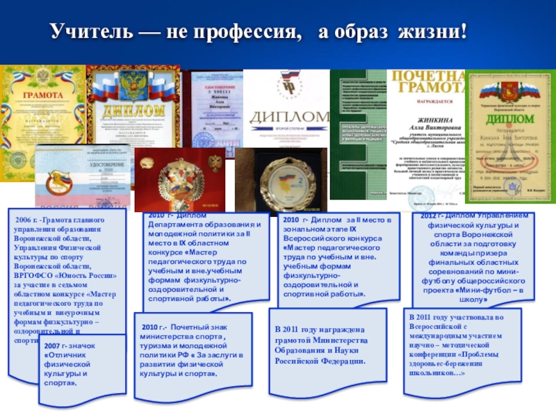 2010 г- Диплом Департамента образования и молодежной политики за II место в IX областном конкурсе «Мастер педагогического труда по учебным и вне.учебным формам физкультурно-оздоровительной и спортивной работы».
